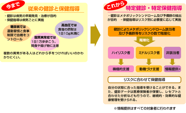 健診受診者を対象に、生活習慣病の発症リスクなどから階層化した3つのグループ(「情報提供」「動機づけ支援」「積極的支援」)ごとに生活習慣病に進行しないようにするための保健指導のことです。